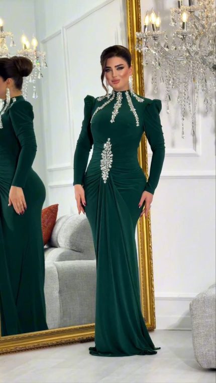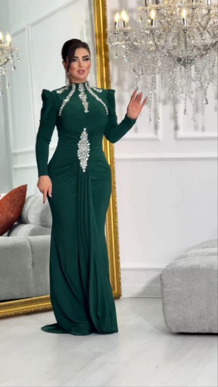 Zena Fashion Hakim Yaka Taş Detaylı Özel Koleksiyon Abiye Yeşil