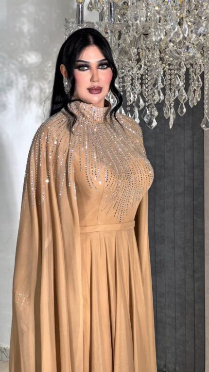 Zena Fashion Pelerin Detaylı Taş Baskı İşlemeli Kloş Abiye Saks