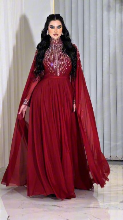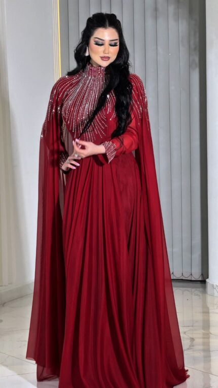 Zena Fashion Pelerin Detaylı Taş Baskı İşlemeli Kloş Abiye Bordo
