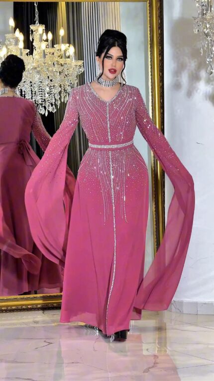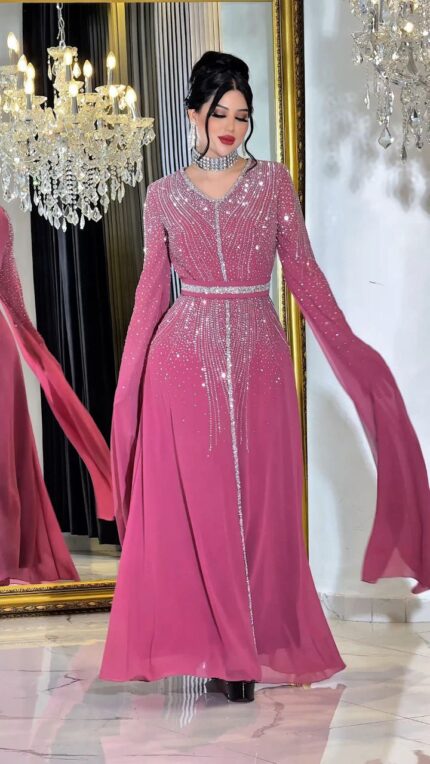 Zena Fashion Taş Baskı Detaylı Kemerli Abiye Elbise Pudra