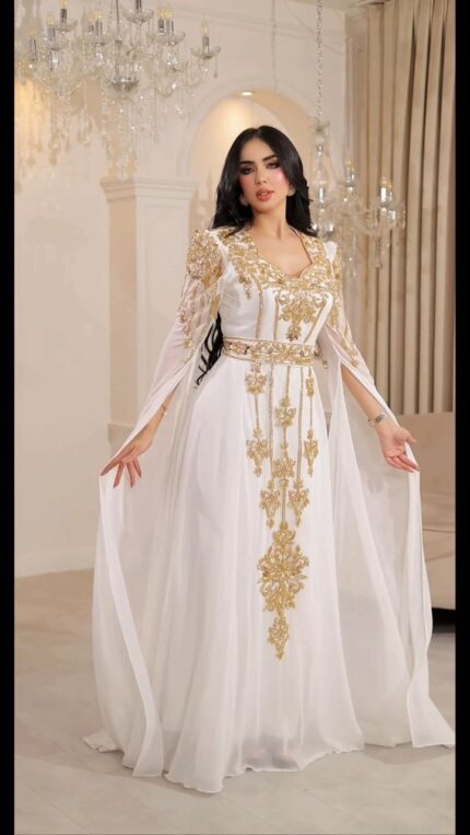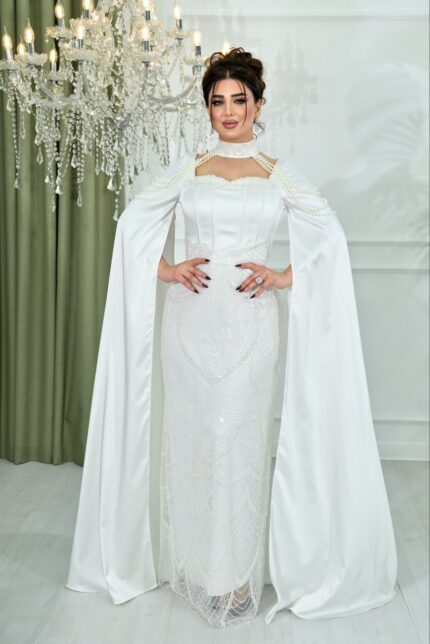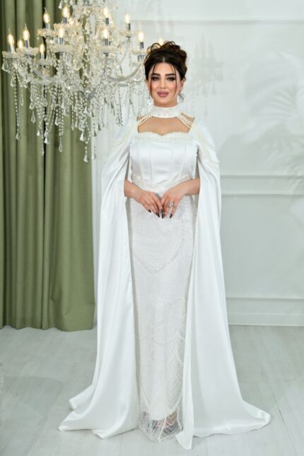 Zena Fashion Taş İşlemeli Sırt Detaylı Pelerin Kollu Yöresel Abiye Beyaz