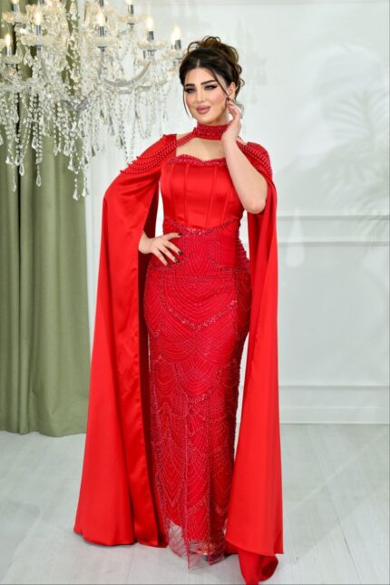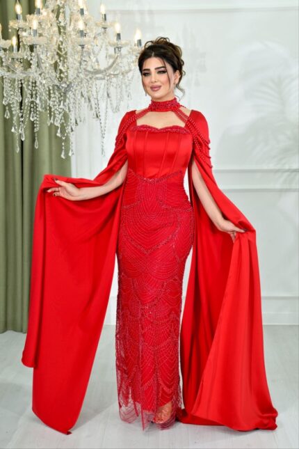 Zena Fashion Taş Boncuk İşlemeli Yaka Detaylı Abiye Kırmızı