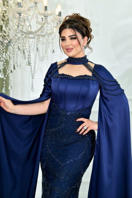 Zena Fashion Taş Püskürtme Bel Detaylı Pelerinli Saten Abiye Bej