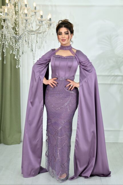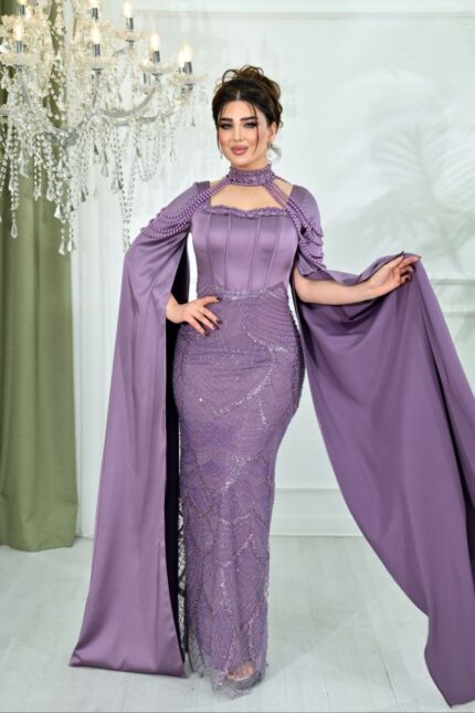 Zena Fashion Taş Püskürtme Bel Detaylı Pelerinli Saten Abiye Mor