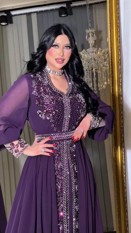 Zena Fashion Taş İşlemeli Bilek Detaylı Kemerli Şifon Mor Abiye