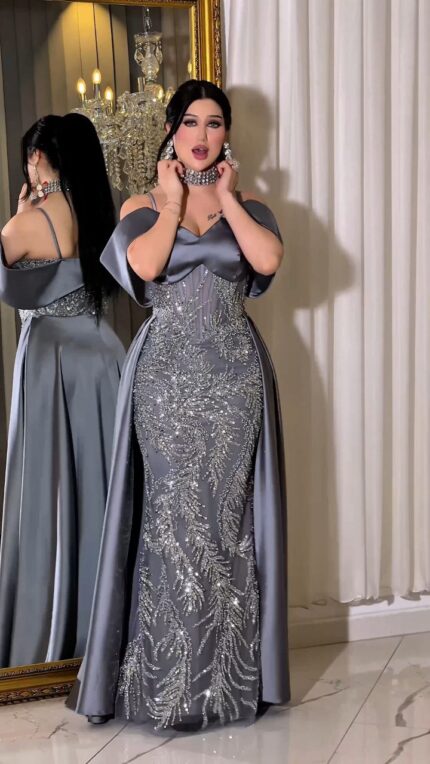 Zena Fashion Kraliçe Stili Kristal Baskı Pelerinli Abiye Gri
