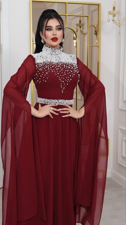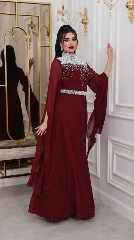 Zena Fashion Boncuk Nakışlı Hakim Yaka Kloş Yöresel Bordo