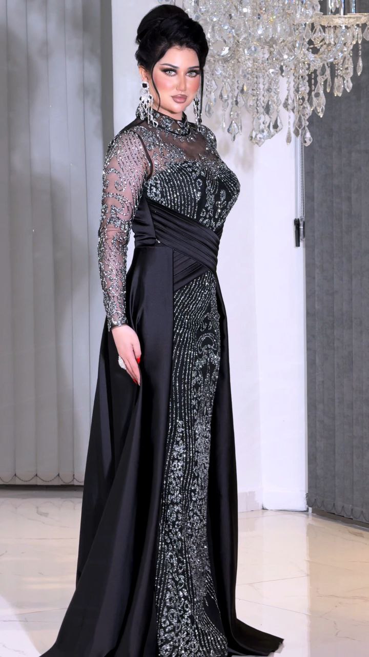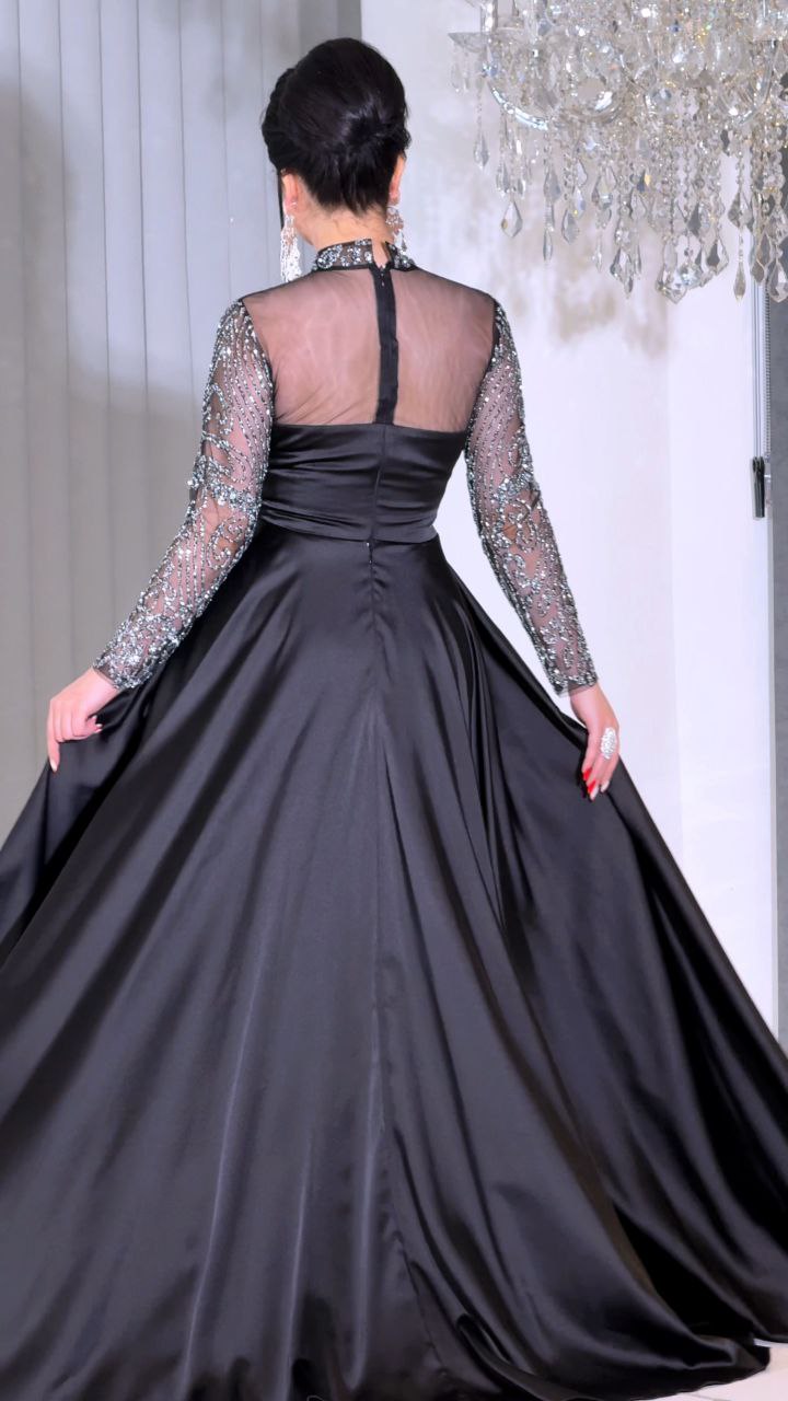Zena Fashion Taş Püskürtme Bel Detaylı Pelerinli Saten Abiye Siyah